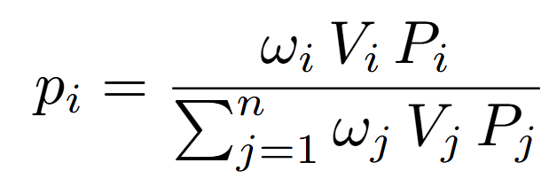 with V_i the available volume at level i, P_i the corresponding price, and omega_i a weighting factor that adjusts the relevance of each level (for example, according to proximity to the mid-price or other microstructure criteria).