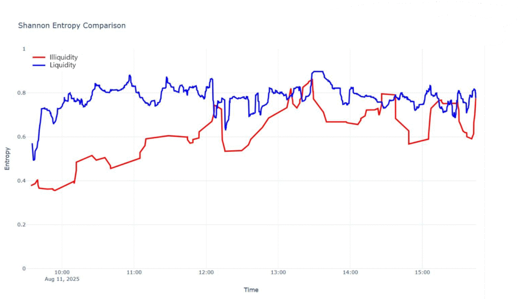 - In general, it allows quantifying the degree of uncertainty or dispersion in the liquidity distribution within the order book. A high value indicates that liquidity is relatively evenly distributed across several price levels, suggesting a more stable market and less vulnerability to sudden changes. In contrast, low entropy reveals that much of the liquidity is concentrated in a few levels, which may imply greater fragility to large orders or unexpected events.